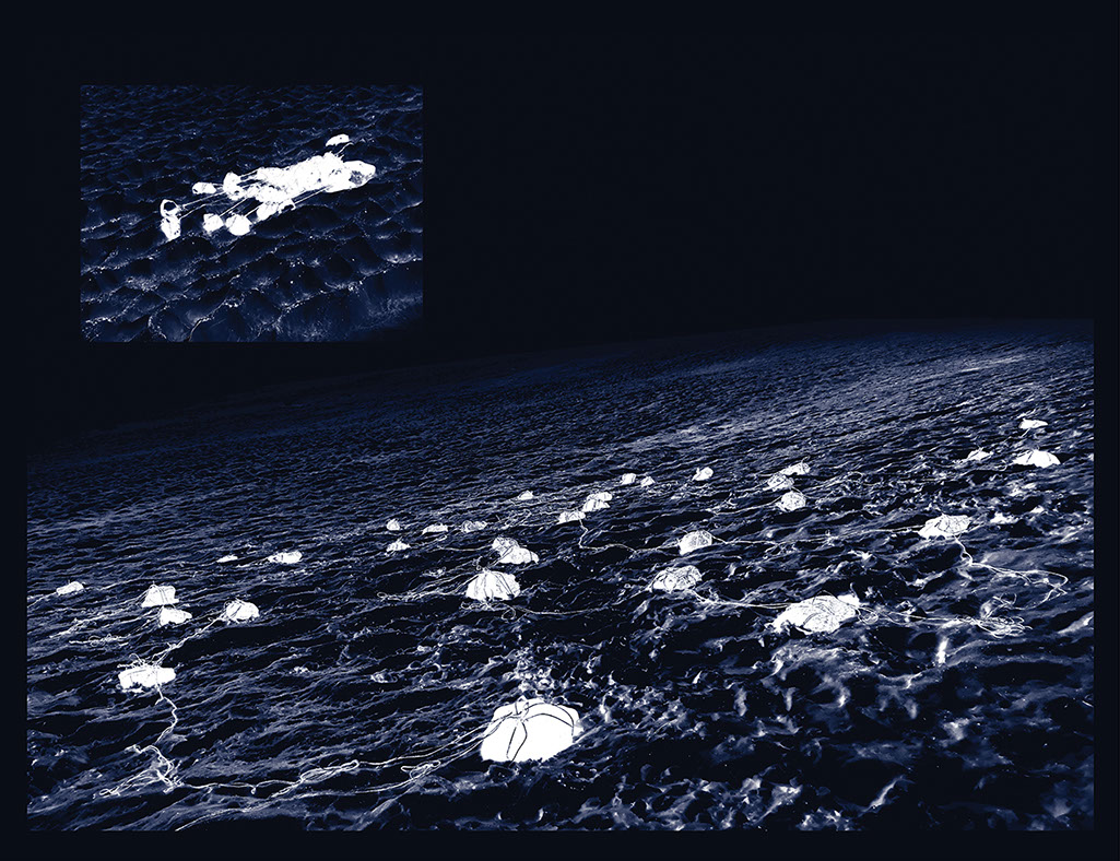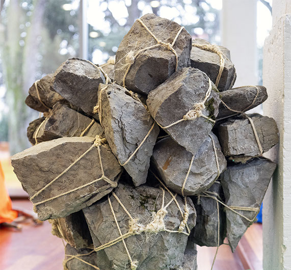 diptyque vidéo (19 min), sculpture (ficelle et fil alimentaire / pierres et ficelle), édition Depuis 32 pierres (impr. numériques), multiple Constellation | comète (impr. numériques), 2020