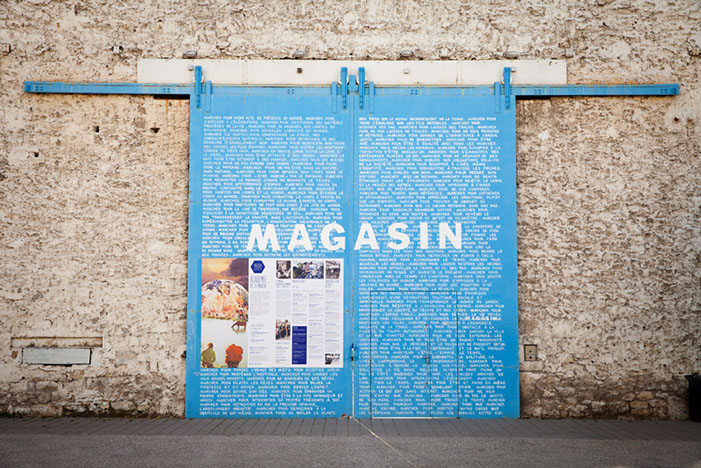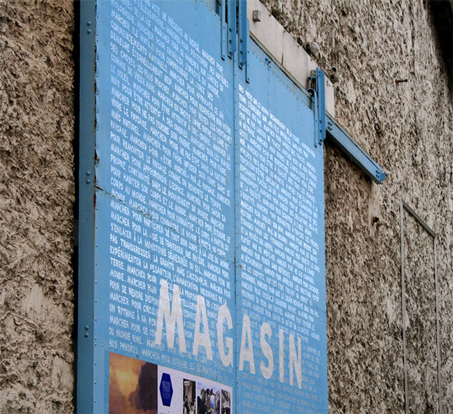 1. Depuis avril 2018, les 150 premières phrases d’Engager un pas sont regroupées et inscrites à la main sur les portes d’entrée du centre d’art Le Magasin des Horizons, à Grenoble.