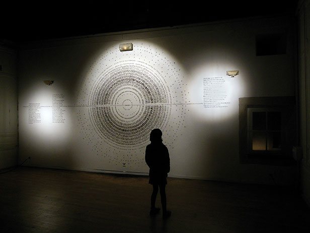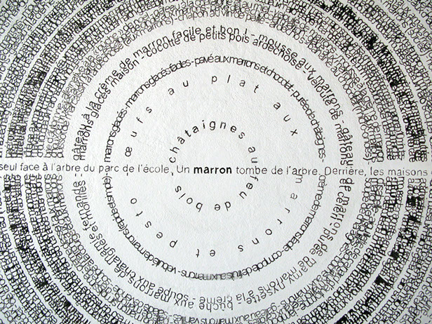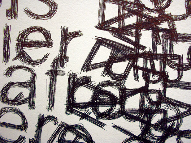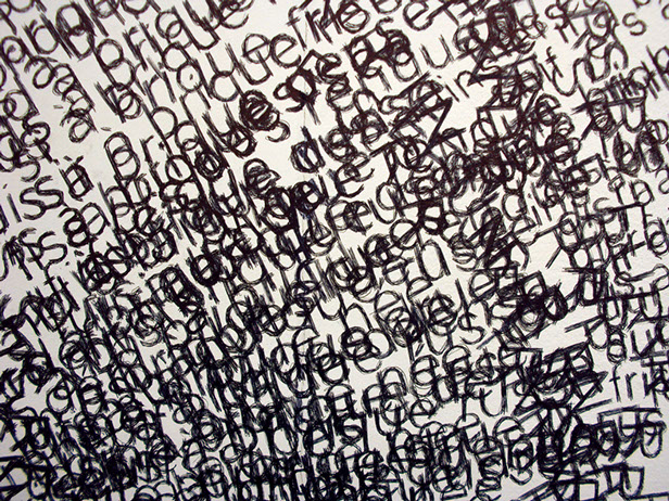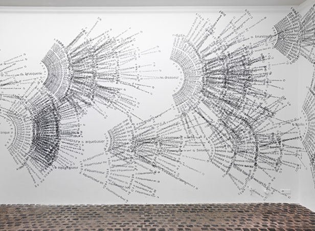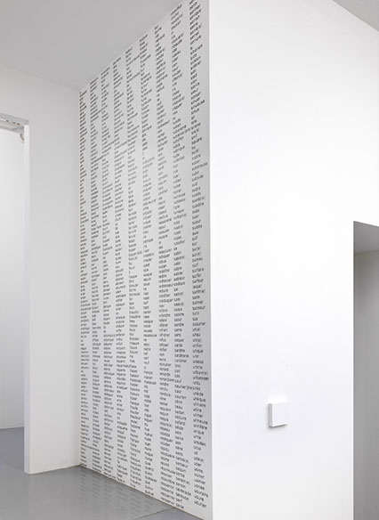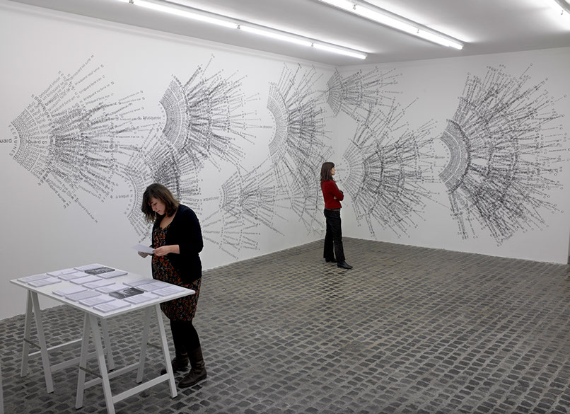 _ Envisagé par le biais de protocoles et confronté à des lieux d’exposition, le texte se déploie et prend la forme de dessins typographiques muraux. Il révèle, parle par les mots mais au-delà. Via des tentatives d’anagrammes, il n’est plus envisagé comme la mise en forme d’une pensée mais comme une matière première triturable et génératrice de pensées.