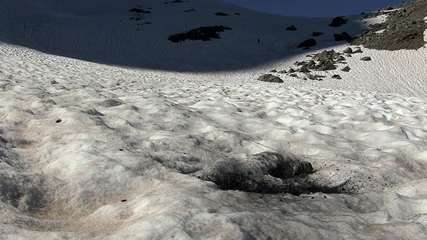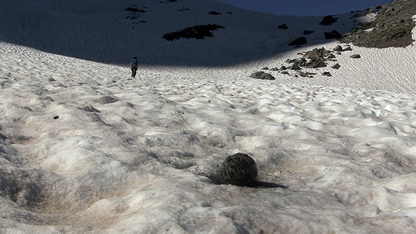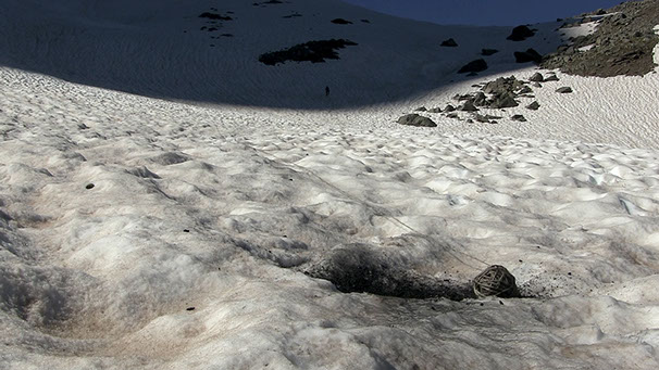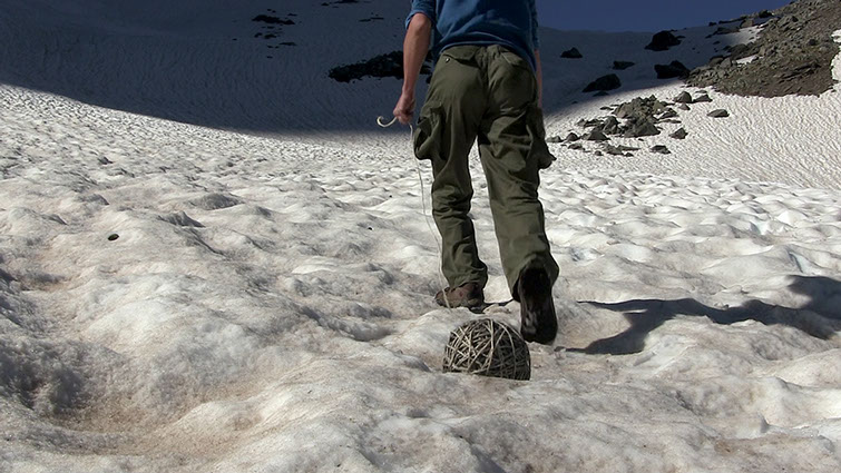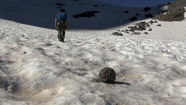 _ Une ficelle imprégnée de cendres est déroulée sur les versants enneigés. Geste vandale fait de frottements et de poussière, marquant d’un graffiti noir la blancheur des névés. Pelote qui s’agite comme une planète emballée dans ses rotations, qui perd progressivement sa forme pour se muer en lien. Prolongement ici d’un feu qui a eut lieu ailleurs, appel et alerte à tous nos incendies, mais aussi pétard mouillé.