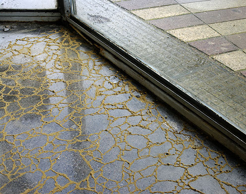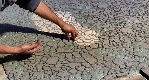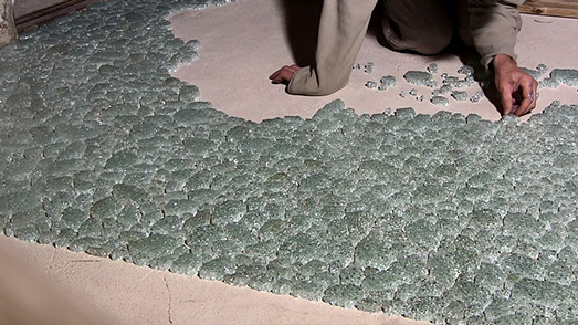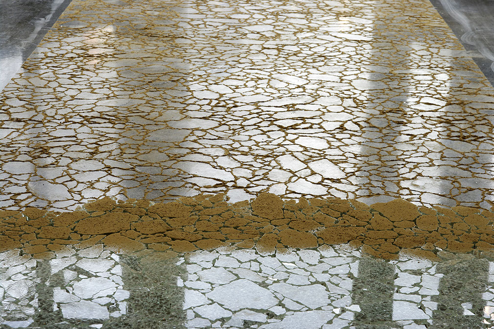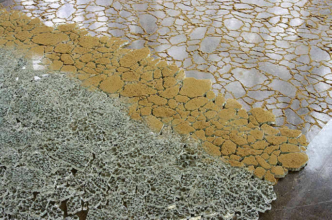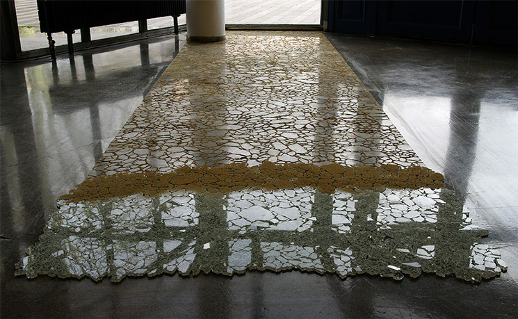 _ L’estran est l’alternance entre un geste de réparation et un geste d’effacement. Partant de verre brisé, l’action consiste, par des tentatives d’assemblage, à retrouver des possibilités de la vitre originale. Les bris de verre, agencés les uns aux autres, sont recouverts d’une pellicule de sable puis récupérés, avant d'être de nouveau disposés au sol pour prolonger l’agencement.