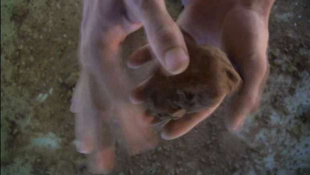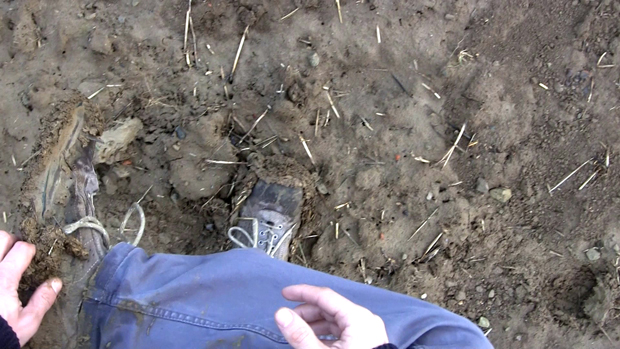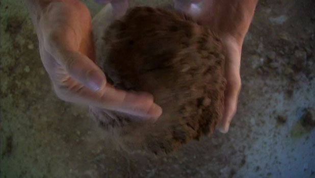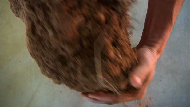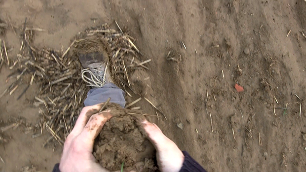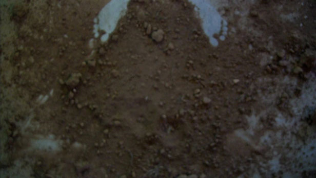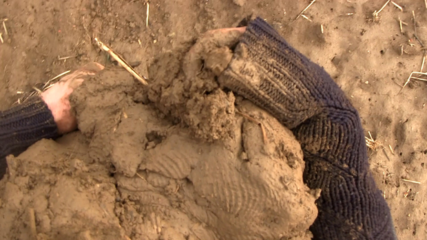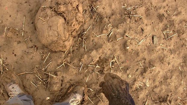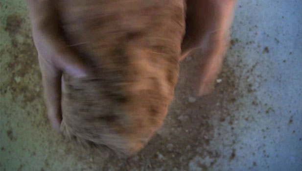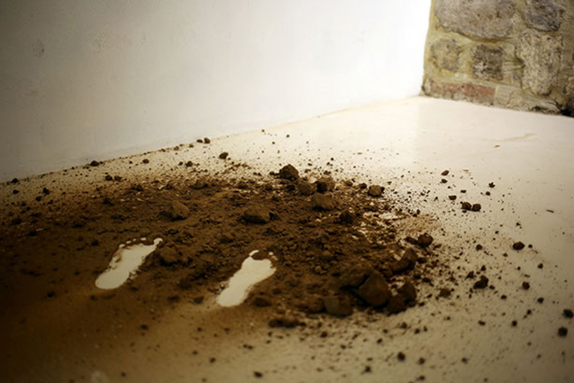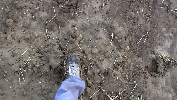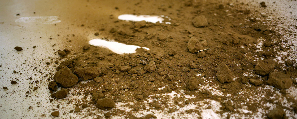 2. Le second temps consiste en la manipulation, à la fois mise en rotation et massage cardiaque, d’un bloc de terre. Terre compressée par le poids d’engins agricoles ou de chantier. Le bloc, passant d’une main à l’autre, s’érode progressivement entre les doigts jusqu’à être totalement dissous. Reste une petite parcelle de terre dispersée comme un sol naissant et l’empreinte négative des pieds révélée.