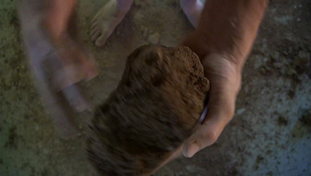 _ Le premier territoire rôde du côté des mythes. C’est une pratique en deux temps constituée de deux gestes complémentaires où, au travers du corps, les notions de terre et de territoire se génèrent et se dévorent l’une l’autre.