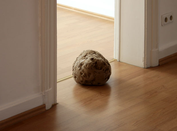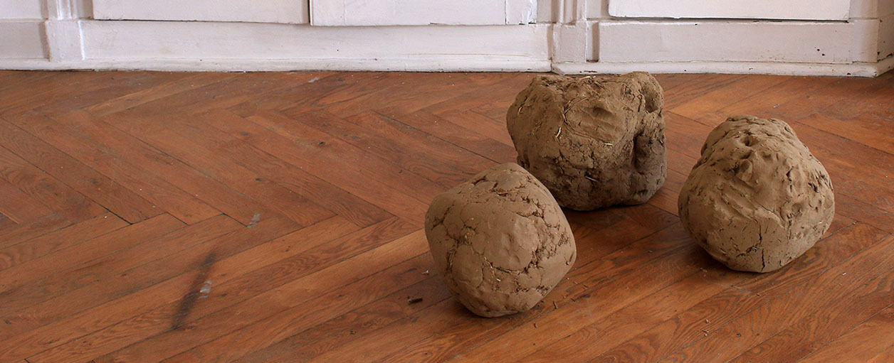 1. Au cours de marches particulières, je prélève à chaque pas la terre accrochée sous mes semelles ; la terre qui se donne. Se forme progressivement une boule, comme une petite planète, façonnée à partir de ce que la marche emporte du sol. Le geste s’interrompt lorsque la boule de terre devient trop lourde et interdit à la marche de se poursuivre.
