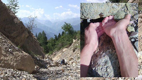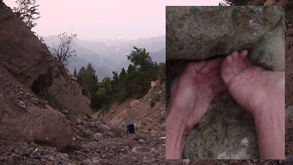 Le premier consiste à loger ses mains dans le fond d’un torrent, se substituer au lit de pierres et supporter le cours de l’eau. Que les mains y infusent, du lever du jour à son coucher. L’écoulement du temps, la continuité du geste ne sont interrompus que par l’épuisement et le changement de batteries des caméras.