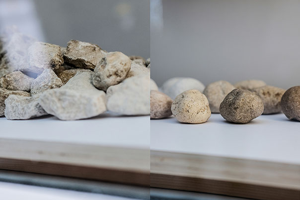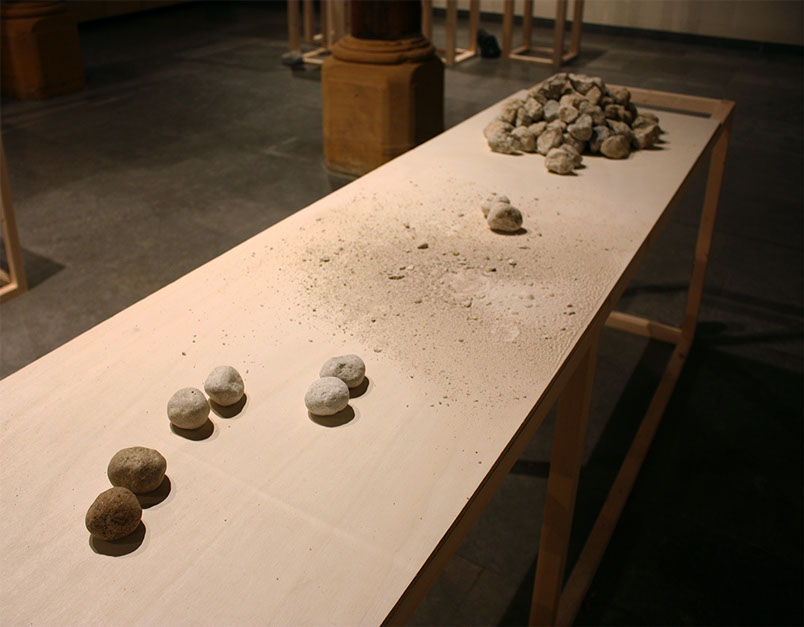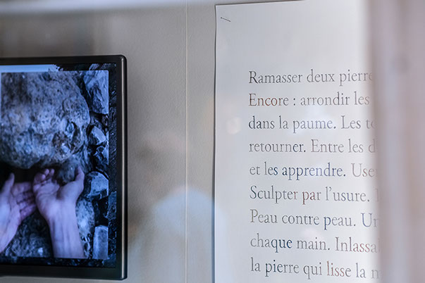 Le second est la lente manipulation de pierres de remblais, percutées puis roulées entre les doigts, inlassablement usées, sculptées par l’usure jusqu’à devenir galet. Ce geste infiltre le quotidien, accompagne les semaines, redouble chaque activité. La pierre et la main s’apprennent et s’apprivoisent, se polissent l’une l’autre. Se confondent.