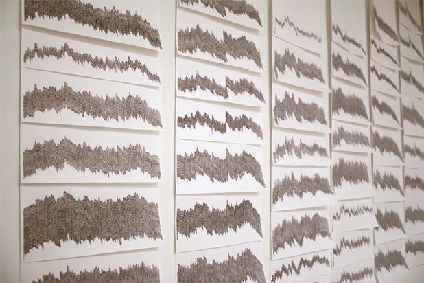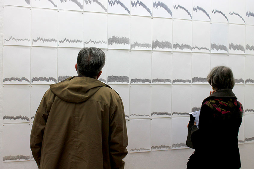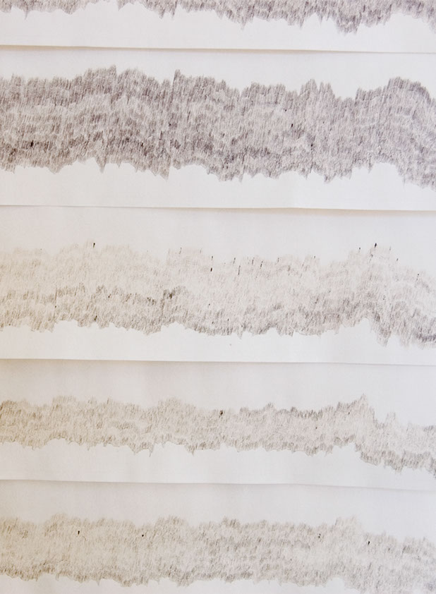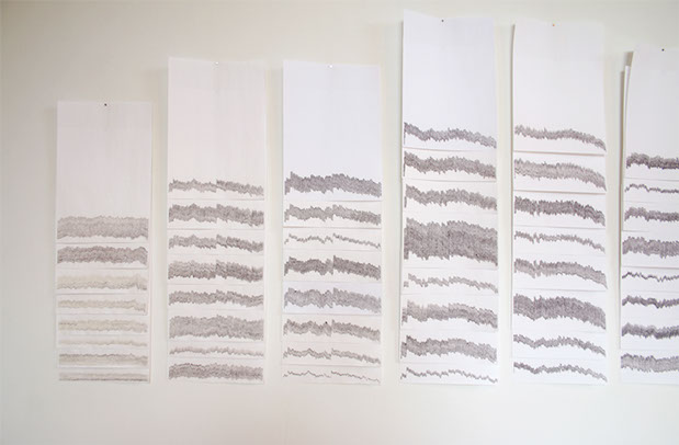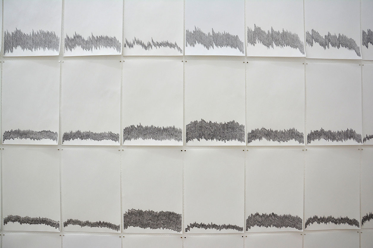C’est un poignet-sismographe qui effleure le papier en gribouillant des lignes légères. Les lignes s’appuient les unes sur les autres, se déforment progressivement. Chaque feuille enregistre les tracés d’une journée, le dessin du jour reprenant les déformations auxquelles le dessin de la veille parvenait. Je dessine comme j’ai pu pointer à l’usine.